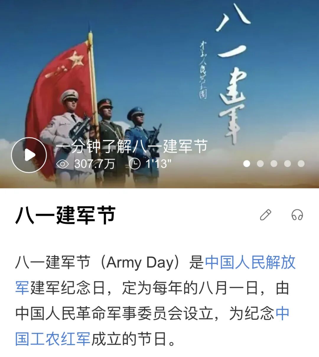 今天是8月1日建军节,为中国人民解放军的建军纪念日。