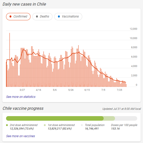 但随着智利政府加强防疫措施,并且继续大力推广疫苗,疫情持续好转:目前第一剂接种人数已经超过了82%,完整2剂接种的也超过了73%。而8月3日,智利新增确诊人数616人,是2020年4月以来的最低点。一些西方媒体转而又将智利当做成功抗疫的典范了。
