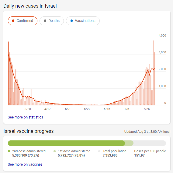 连在疫苗施打策略上最为激进,完整接种2剂疫苗的人口比例超过7成的以色列,也出现了疫情反弹。