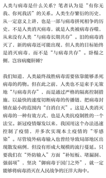 所以如果有人认为自己应该和病毒“你死我活”,“誓死不共存”,那没问题,我们尊重。但不要试图挑拨民意,甚至对国家主管部门进行道德绑架。