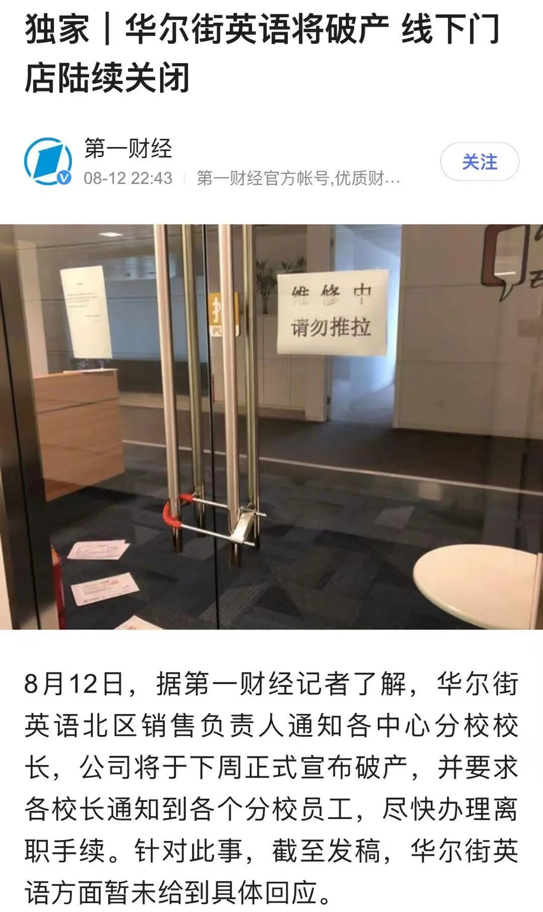 不过这倒让我们想到了另外一个关于英语培训机构的新闻,只是不是少儿英语,而是知名的成人英语学习机构华尔街英语前段时间传来了不好的消息 —— 根据第一财经的报道,华尔街英语可能近期要宣布破产。