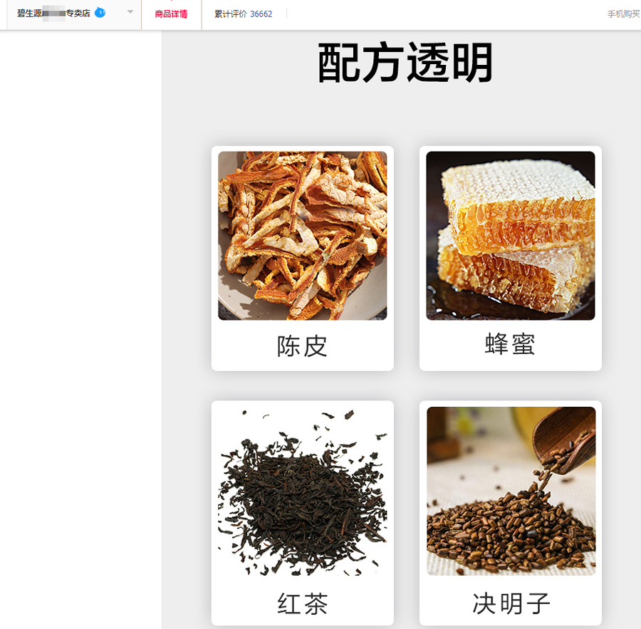 再对比一下淘宝店铺广告上“配方透明”宣传中的名单。嗯......好像某种成分真的“被透明”了呢。