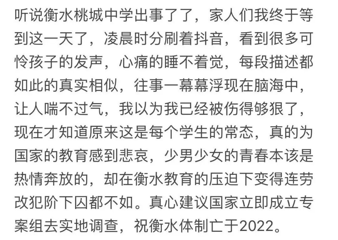 衡水模式起源于衡水中学(包括面向全省和外省招生的私立学校),之后逐步扩张到衡水市的其他中学,比如此次新闻中的衡水桃中(原衡水五中)。在看到桃中事件之后,当时想到的,就是2020年知乎上一篇来自衡水二中的一个毕业生的帖子。为了帮助大家更好的了解这些学习衡水模式的学校出现的问题,我们就节选其中描述经历的部分内容:
