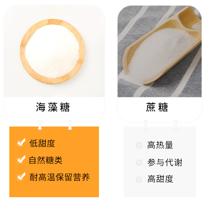 但有些所谓的“0蔗糖”并不是0添加糖,而是用其他的糖来替代蔗糖,这种情况下,其实广告之外意义就很有限了。比如下面这个食物用海藻糖来替代蔗糖。一个蔗糖分子在人体内会代谢成一个葡萄糖和一个果糖,而一个海藻糖则会分解成两个葡萄糖。对人体的糖摄入并没有特别的改善,虽然让血糖升高的速度会慢一些,但却要持续更长的时间。