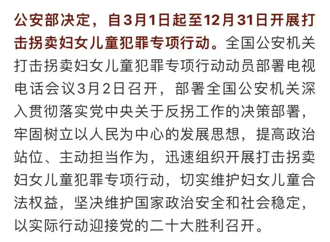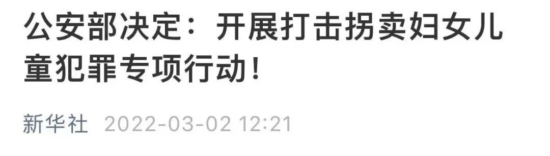 此外,今天央媒还发了另外一则新闻,就是公安部会在今年全年开展打击贩卖妇女儿童犯罪的专项活动。