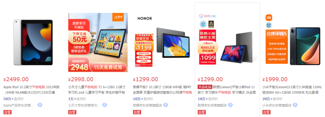 上图左起:iPad(2499元),小天才儿童平板(2998元),荣耀平板(1299元),联想平板(1299元),小米平板(1999元)。