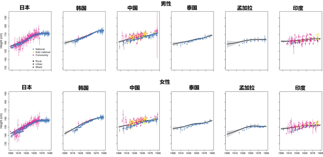 比如在一些国家经济、饮食情况得到持续改善的情况下,人口的平均身高就有了显著变化。日本在二战之后,开始大量推进在饮食中增加肉类和奶类,提高蛋白质的每日摄入量,相应的,日本人的平均身高也有了快速的提升。同样,我国改革开放之后,随着经济条件改善,新一代年轻人的平均身高,也比他们的父辈、祖辈增加了不少。