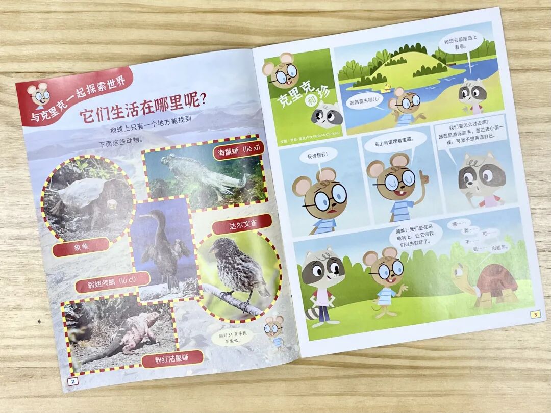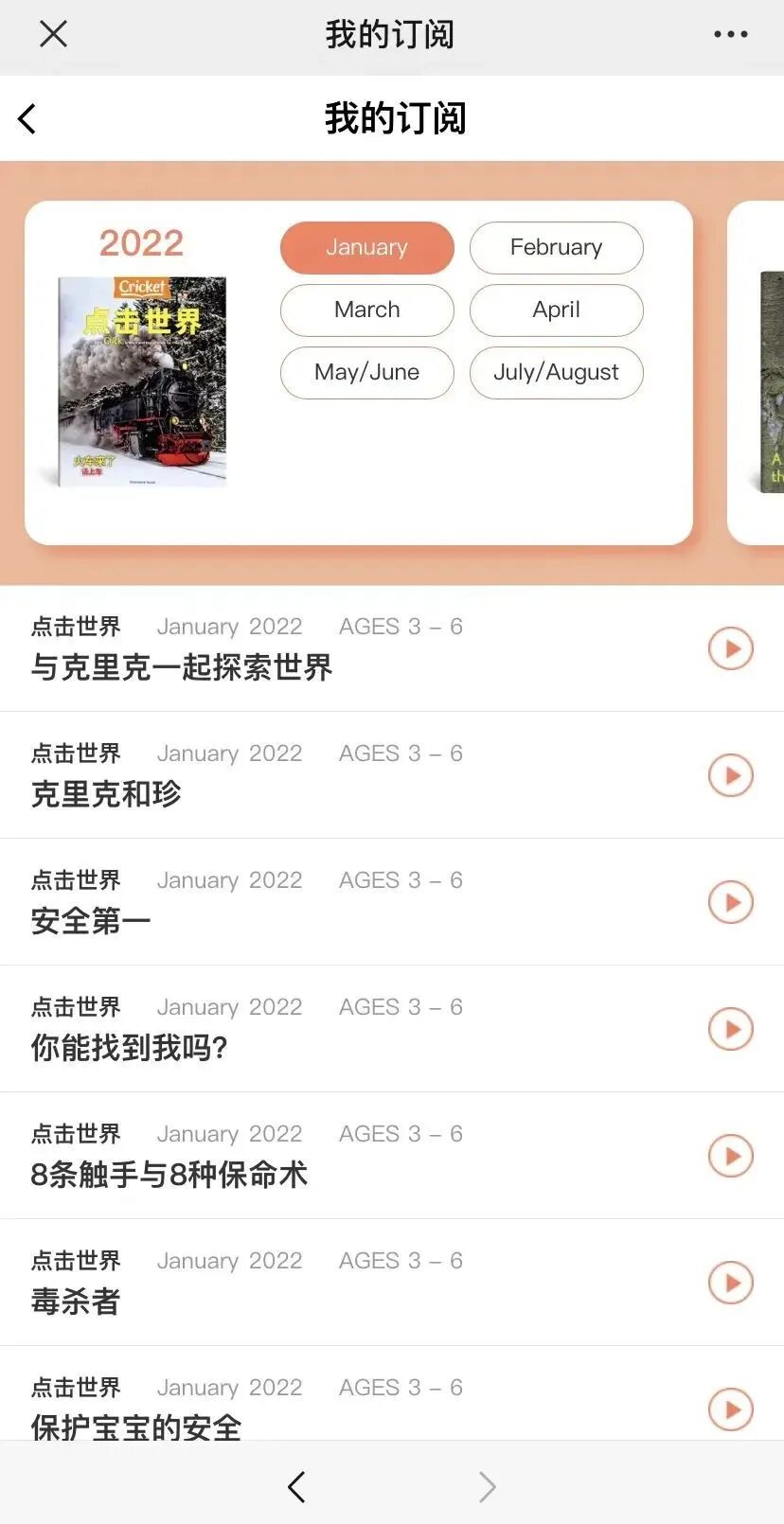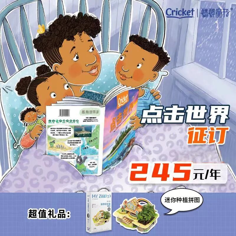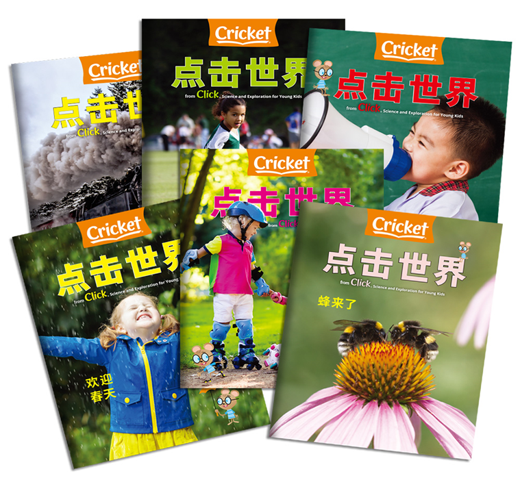 “下载PPT,分享好故事”可以锻炼小朋友的表达能力。用PPT的形式帮助小朋友巩固知识,鼓励小朋友去用自己语言来讲故事,直接下载后还可以作为知识分享或者知识小报,非常方便。蟋蟀童书Cricket Media自1973年创办第一本杂志以来,曾出版过西班牙语、法语杂志,但之前一直没有出版过中文杂志。2021年《点击世界》中文版创刊了。近50年后的今天,美国官方还在持续出版的共有10种杂志中,其中9本是英文杂志,另1本就是《点击世界》中文版了。《点击世界》中文版所有的科普启蒙内容都是新鲜出炉的,与英文版内容基本保持一致。依托蟋蟀童书Cricket Media强大高效的编辑制作团队,当期杂志在北美和中国市场可以保持同步上市。这也是我们选择它开团的理由,希望国内的孩子可以第一时间阅读到与国外孩子一样的内容。而在沟通会议上,我们跟《点击世界》的同事沟通了很久,来了解他们是如何能保证中文版和英文版可以同步出版,并且能一方面保证翻译质量,一方面能确保内容符合中国小读者的需求,最后终于有充分的信心来推荐这套杂志。《好奇号》面对的是小学学生,而《点击世界》中文版则是面对幼儿园和幼小衔接阶段的小朋友,这个阶段的的孩子阅读能力还无法达到能够阅读大篇文字和复杂知识的杂志,这套科普启蒙杂志则是为国内3-7岁,这个阶段的孩子所准备的。作为科学启蒙杂志,《点击世界》用简单风趣的语言,漫画、插画和文字结合的方式向孩子们介绍了科学、艺术、自然和环境等,告诉孩子们自然、宇宙以及人类本身的运转规律和奇妙之处。同时在每期的杂志后面有个拉页,让孩子们做一些手工实验,提高孩子们的动手动脑能力。整本杂志在40页左右,虽然看起来很薄,但是内涵丰富,对于小龄的孩子来说,长度正好,不会很有压力,完整读完后还很有成就感。《点击世界》中文版和英文版是同期出版,而在美国,由于每年的5月下旬开始直到8月是漫长的暑假,每年的11月12月,会迎来西方传统的感恩节、圣诞节,所以蟋蟀童书的所有杂志都是5/6月,7/8月,11/12月合刊。因此《点击世界》中文版保持着和英文版一样的出版规则,全年共9期(除了1~4月,9月、10月是单月出版,5/6月,7/8月,11/12月是合刊出版)。