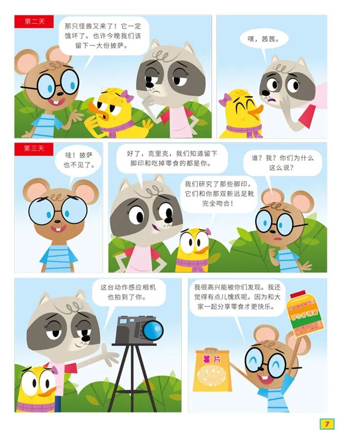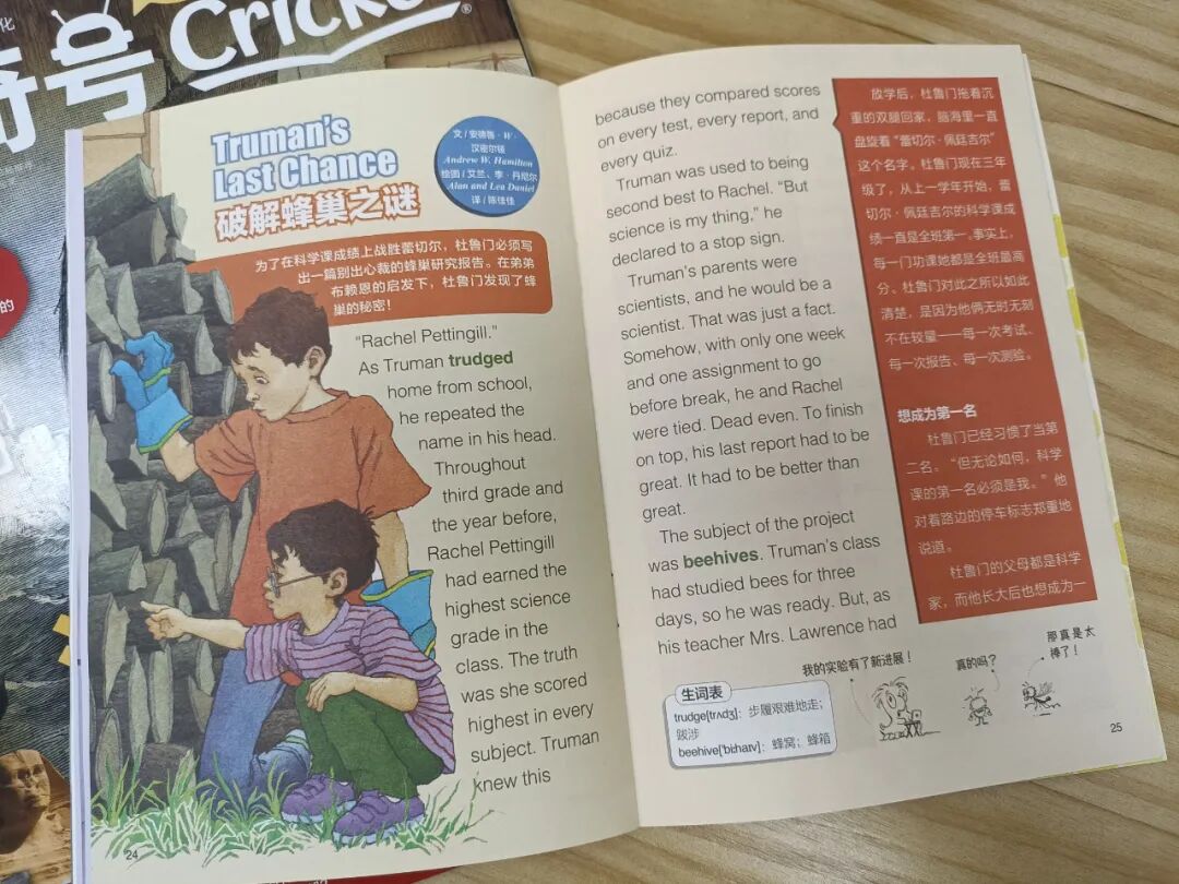 “好奇时刻”板块包含自然、人体、生物学等孩子们感兴趣的内容。"头脑王者"的游戏内容大都是锻炼小朋友思维能力的,扫描同页的二维码可以获取答案。另外,《好奇号》还有很多读者互动活动,比如不定期举办有奖活动,6月份公司同事的孩子参加了2022年6月号举办的“养龟大赛”活动,很幸运中奖了,前两天收到了杂志社寄来的“忍者神龟”。这也说明杂志编辑们的确很用心和真实地和小读者们沟通互动。“好奇挑战者”也是好奇号的有奖活动,版块里面的题目都可以在同期的好奇号杂志中找到。另外还有常规的是“读者调查表”,同样是扫描二维码参与活动并有机会赢得礼品。每期《好奇号》赠阅的双语儿童文学读物来自Cricket Media旗下的知名杂志Spider。这本杂读物在母语国家是6-9岁孩子阅读,充满趣味性和想象力,英文难度也不是很大,常适合小学阶段的小朋友。以及三个图文结合的小故事,配图全是手绘插画,非常精美,附有中文翻译和生词表。每期附赠的导读视频都可以在《好奇号》杂志的公众号上看到,让孩子和家长大概了解本期杂志内容。《好奇号》还有两个非常实用的设计:“好奇喵读给你听”和“下载PPT,分享好故事”。