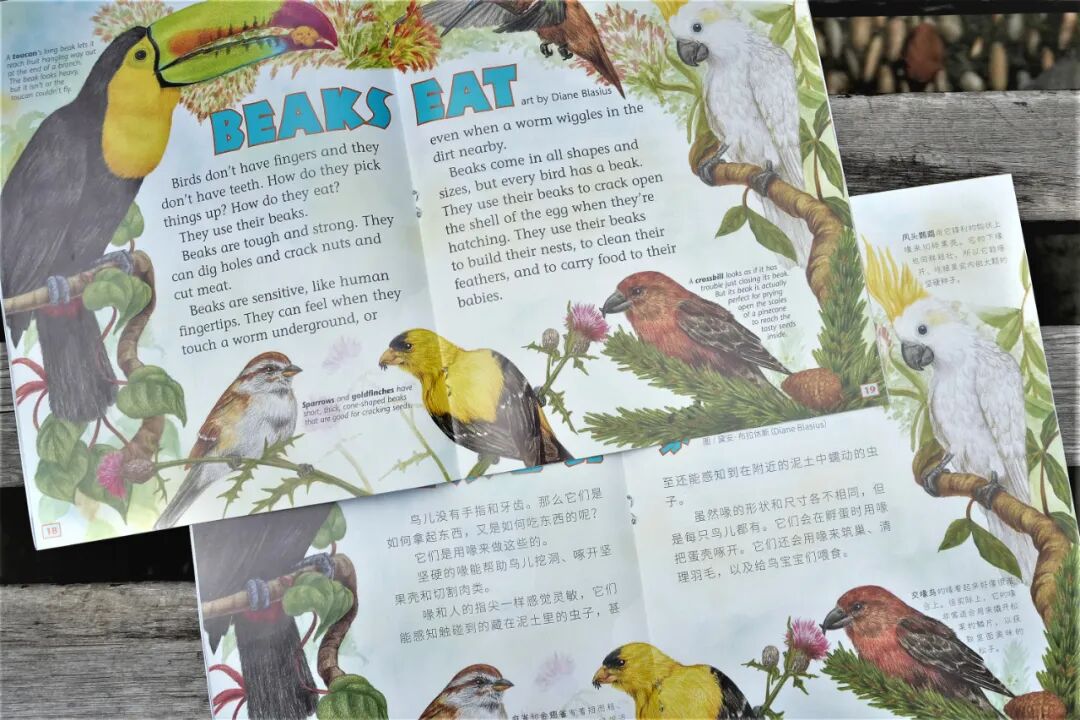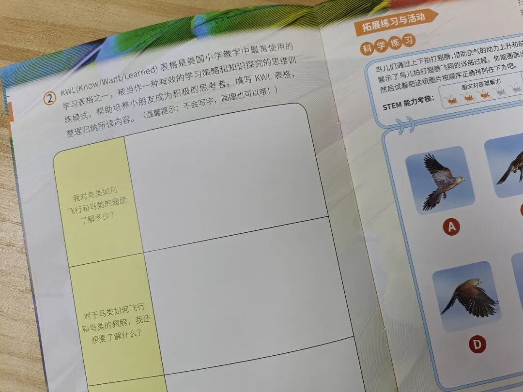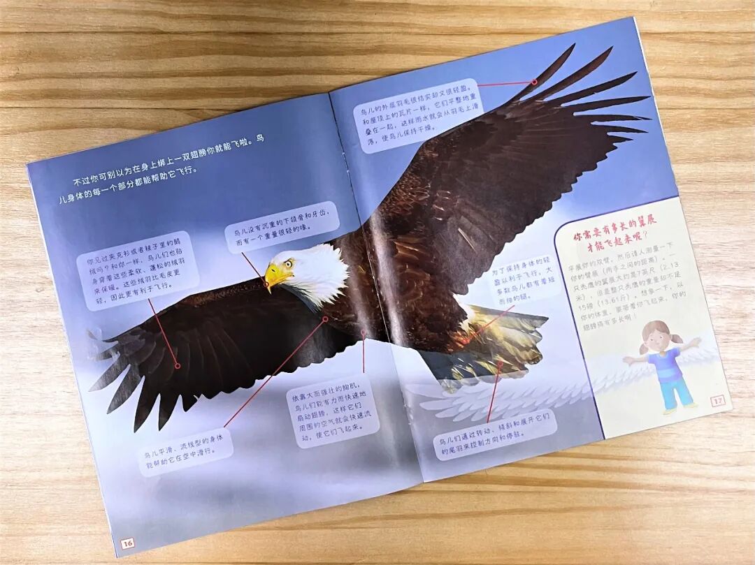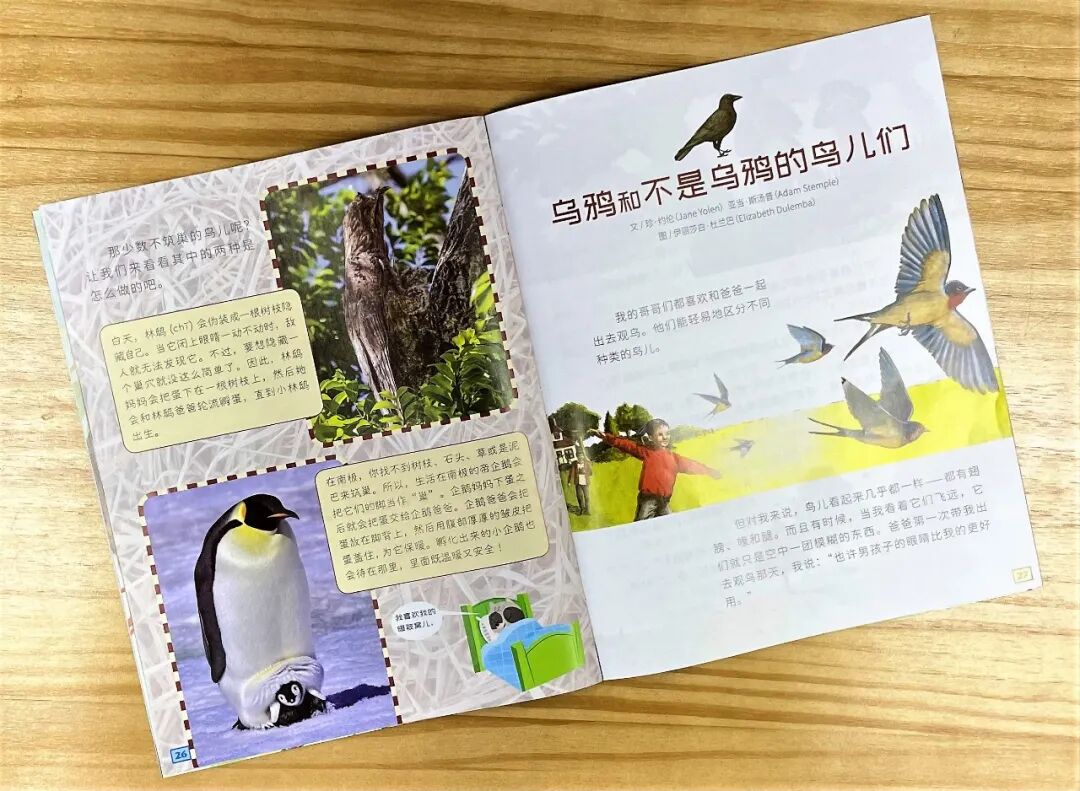 之后,通过图文并茂的形式,介绍了鸟类的羽毛、翅膀、喙以及巢穴。可谓衣食住行都照顾到了。最后以一篇《乌鸦和不是乌鸦的鸟儿们》的科普文学结束,讲述了一个小女孩和她的哥哥、爸爸外出观鸟分辨鸟儿种类的故事。最后的手工板块一定是配合主题的,一起做一只美丽的小鸟吧。《点击世界》是一套很不错的科普启蒙读物,能让孩子对很多事物建立系统的初步认知,培养孩子的科学思维,让孩子从小养成科学探究精神。【出版公司】:少年先锋报社