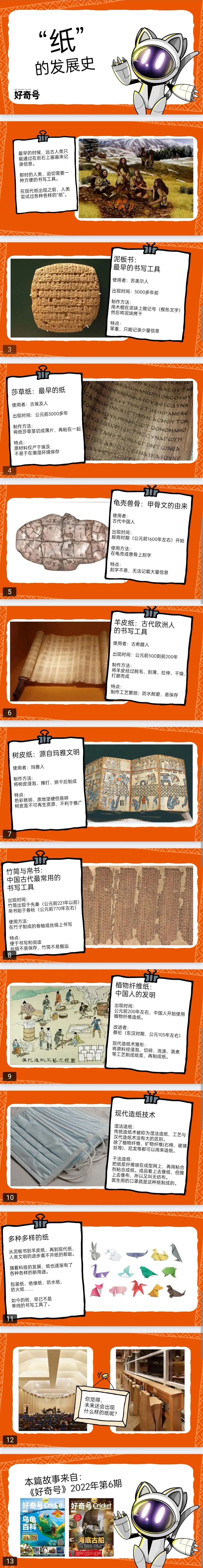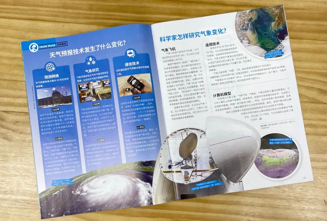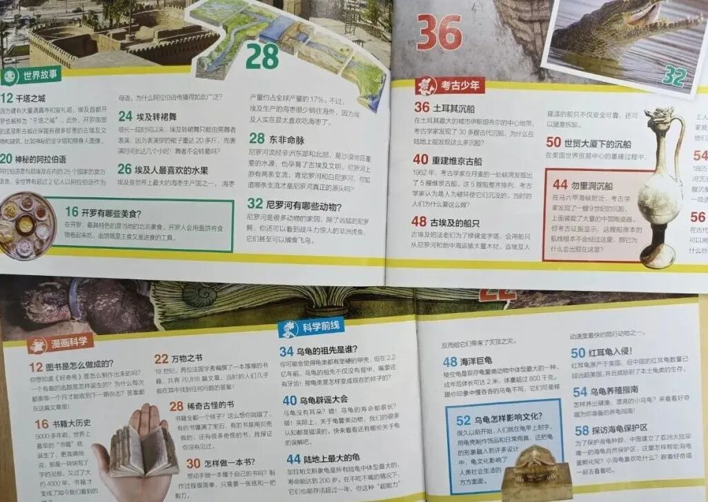 同时在字体大小和版式设计时,《好奇号》的设计团队也充分考虑了小朋友的阅读习惯,让图片成为内容的一部分,保证视觉冲击力,视觉效果,使图片能够更有效地辅助孩子阅读。每一个板块都是一个主题,内容围绕主题展开,可以帮助孩子从多个方面了解某一领域的知识,建立起系统的知识结构。每个板块的内容均采编自蟋蟀童书Cricket Media旗下的五本杂志:Muse(前沿科普)、Ask(漫画科普)、Faces(世界文化/地理)以及Dig(考古/历史)或Cricket(儿童文学)。《好奇号》每一期的内容会从上面五本杂志的内容库中进行筛选,选择重要、有趣、适合中国孩子阅读的内容,然后进行内容的组合与编排。同时《好奇号》还有丰富的读者互动活动,比如不定期的有奖活动、好奇挑战者、读者调查表等等,听说中奖率还挺高的。“科学前线”板块,内容主要选自探索科学前沿的Muse(少儿科学杂志),涉及了太空探索、生命科学、人工智能、物理学、数学、地球科学等前沿科学领域。在这个板块中,小读者们会看到当前一些重要的科学进展,让孩子们了解当今科学技术的发展。比如在2022年3月号的这个板块中,给孩子们介绍了天气预报的技术发展,以及如何进行群体预测。“漫画科学”板块的内容来自Ask(少儿漫画科普杂志),通过孩子们最喜欢的的漫画形式,将有趣的故事结合进来,带领孩子们探索世界,为千奇百怪的自然现象寻找最科学的答案。在2022年6月号中,介绍了图书的制作、图书的历史,以及各式各样的“百科全书”和“折纸书”、“石刻书”、“珍宝书”等稀奇古怪的书籍。“世界故事”板块的内容来自Faces(少儿世界文化和自然风貌杂志),每期都会报道不同国家和地区的民俗风情、民间传说、历史传统和自然风貌,让小朋友们足不出户,游遍全世界。比如在2022年6月号中,讲述的是埃及地区的人文故事,在这期杂志中,孩子们能了解到“千塔之城”的埃及首都开罗,埃及人的语言、舞蹈等文化,还有神秘的尼罗河……“科学前线”,“漫画科学”和“世界故事”3个板块基本上每期都会出现,“考古少年”和“蟋蟀文学”会交替出现。偶尔也会有特别专题,比如2022年6月号,特别专题“乌龟百科”就替换了常规的固定栏目“漫画科学”。“考古少年”板块的内容来自Dig(儿童考古和历史杂志),在这个板块中,小读者们能学习到人类历史上的重大考古发现和文明成就,引领孩子们进入神秘的考古世界,帮助他们了解人类历史上的重要人物,了解人类文明的发展进程,以及一些重大成就的前世今生。比如:2022年6月号中,考古少年板块介绍了各式各样的沉船,和海上丝绸之路。“蟋蟀文学”板块内容选自Cricket(儿童文学杂志),每期的蟋蟀文学里,精选了很多儿童文学家创作的优秀经典故事,每一个充满奇思妙想和人文关怀的故事,都是一个多彩的文学世界。以此来激发小朋友对阅读及创作的兴趣。比如在3月号的蟋蟀文学中,小读者们可以跟着迪伦和他的小伙伴们一起去冒险,还能看到卡捷琳娜的奇幻经历。除此之外,《好奇号》还有很多吸引小朋友的特色板块:走在科学前沿的“新发现”、“有趣的日常现象”的知识板块、锻炼小朋友思维观察能力的“头脑王者”和读者互动版块等。“新发现”板块包含天文、生物、地理、机器人等学科的最新前沿发现。