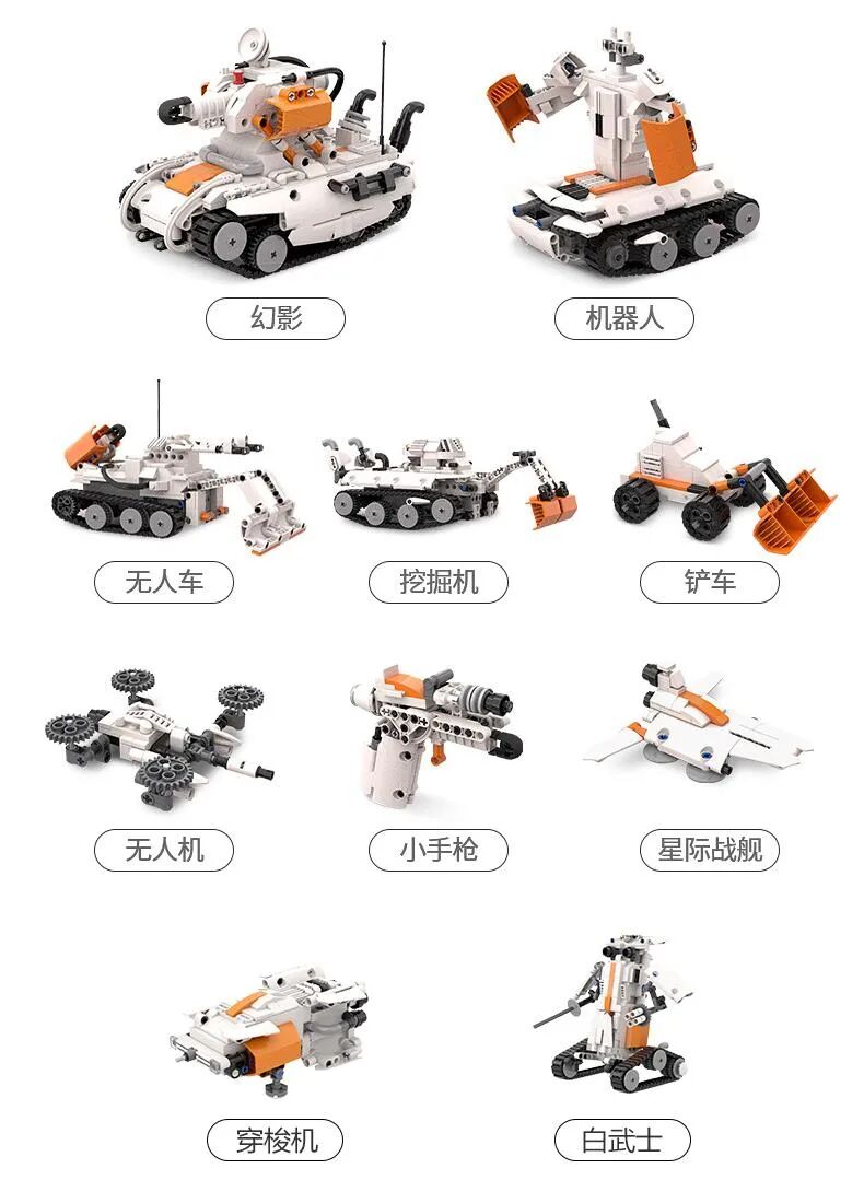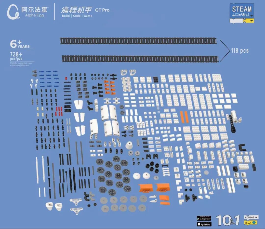 在硬件上,阿尔法蛋编程机甲配备了丰富的积木零件,一共有728个。官方提供了10种不同模型的搭建,小朋友熟悉之后当然可以自己改进。这套产品采用的是和普通乐高同等规格,可兼容的尺寸,方便小朋友以后自由发挥、扩展。