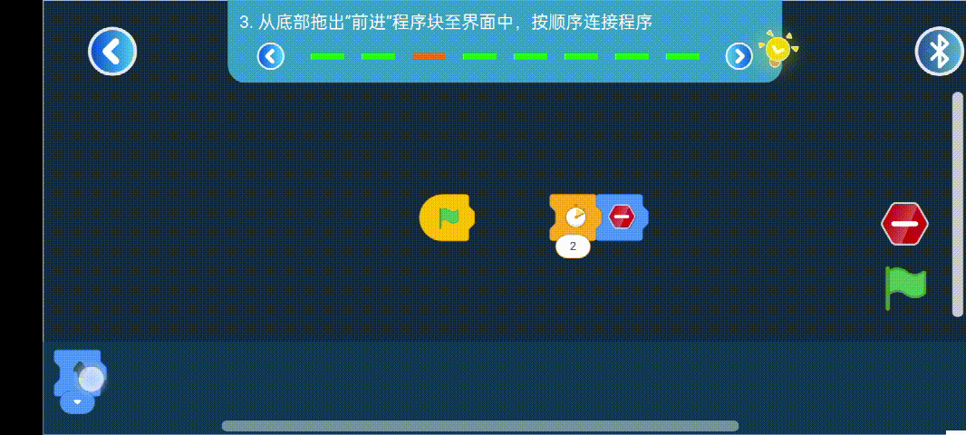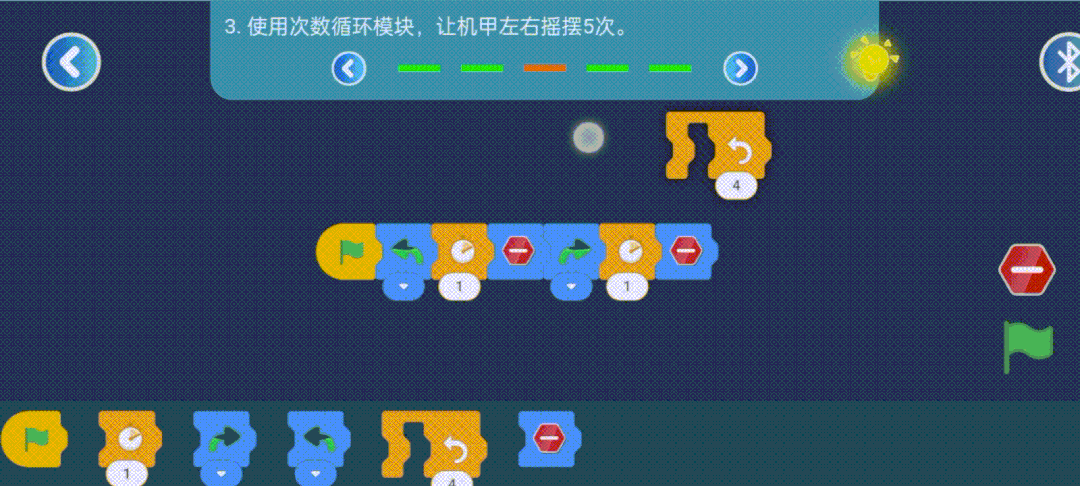 编程任务具有提醒功能,当孩子遇到不会的编程任务时,可以点击黄色小灯泡获取提示,引导孩子完成编程任务。