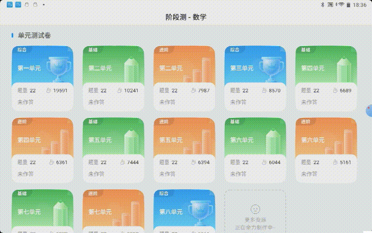 科大讯飞AI学习机还提供了小学阶段的数学、语文学科的阶段测功能,阶段测里面是孩子学习的对应学期内各个单元的单元测试卷,以及期中期末的专项复习卷。