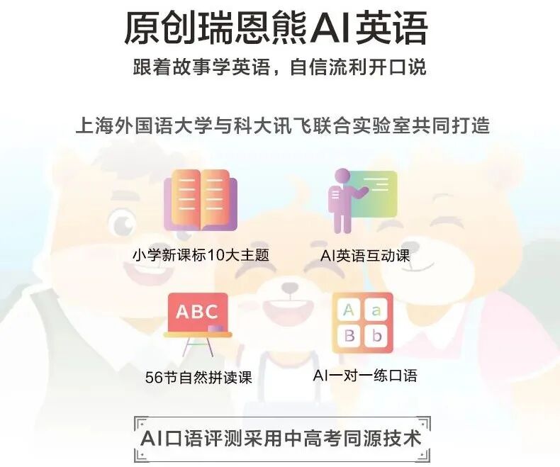 除此之外,为了让幼儿孩子能够开口自信讲英语,科大讯飞联合上海外国语大学共同研发了「瑞恩熊 AI 英语」。瑞恩熊 AI 英语采用的是闯关的模式,一共有六个阶段,共 200 节课。