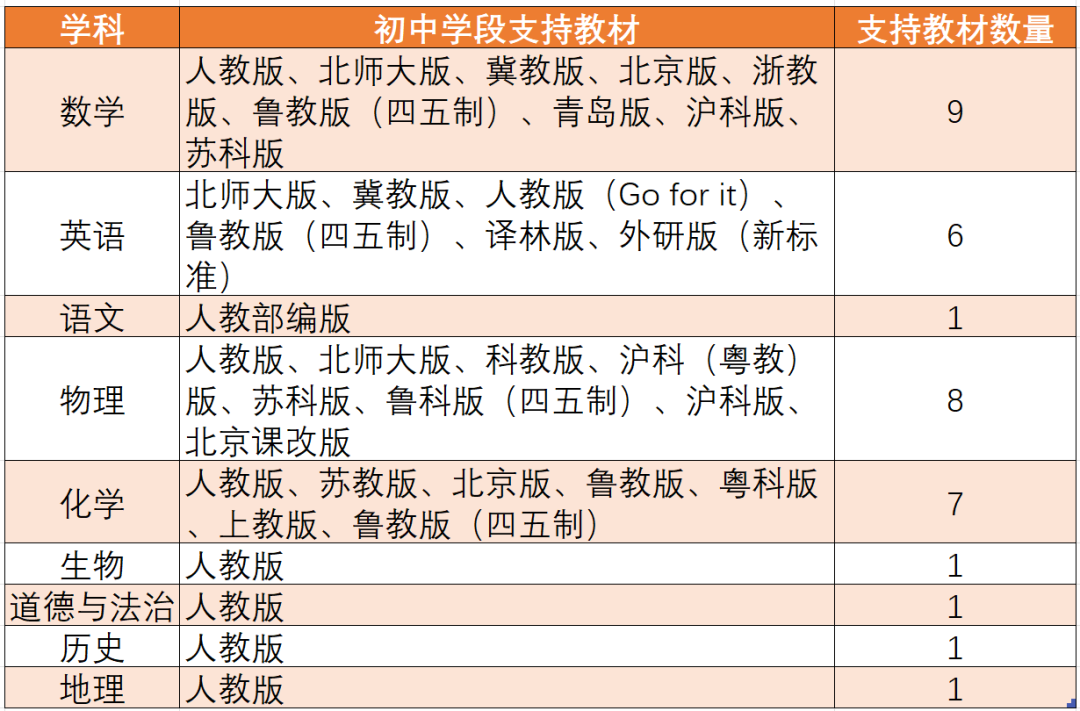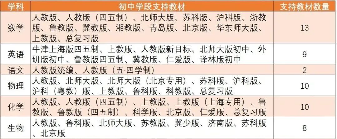 网易有道支持学科教材略少一些,列表如下。