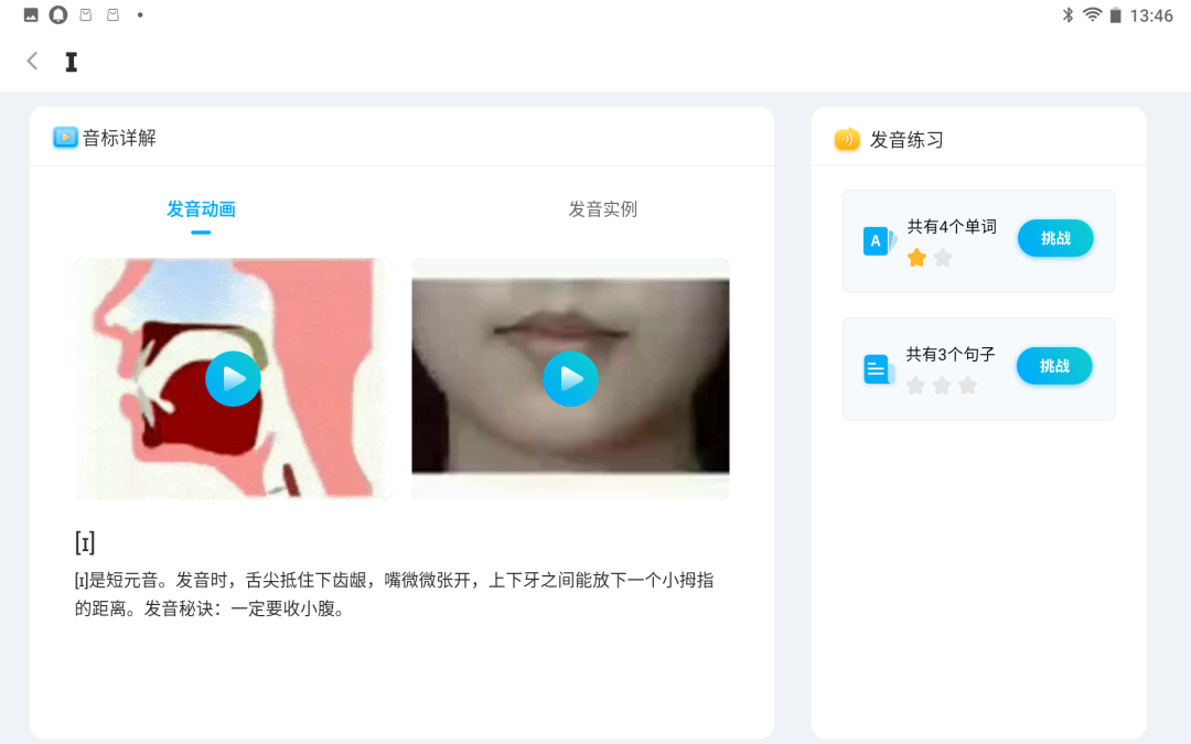 音标练习是针对音标、单个单词和短句的练习,学习当前英语的发音方法以及正确的读音,通过动画和真人视频进行讲解。