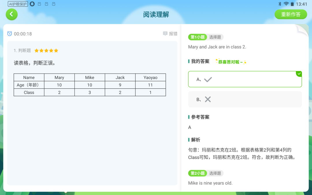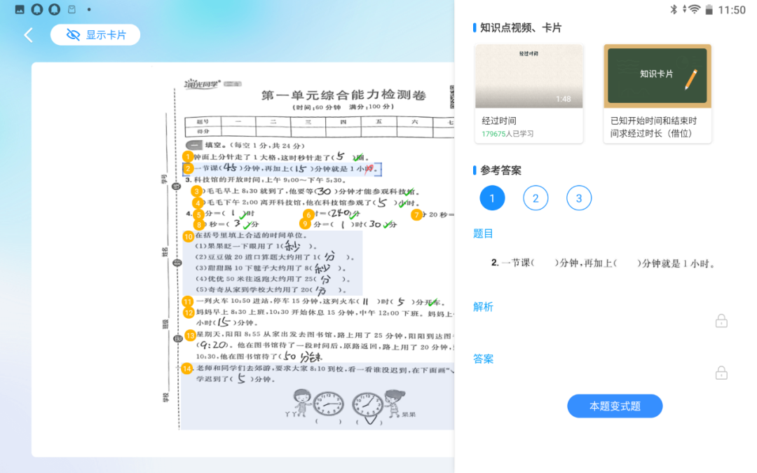 每进行一道习题的测试,都可以及时的进行批改。每道题都会有参考答案以及试题的解析,帮助孩子学习当前习题的知识点,举一反三。