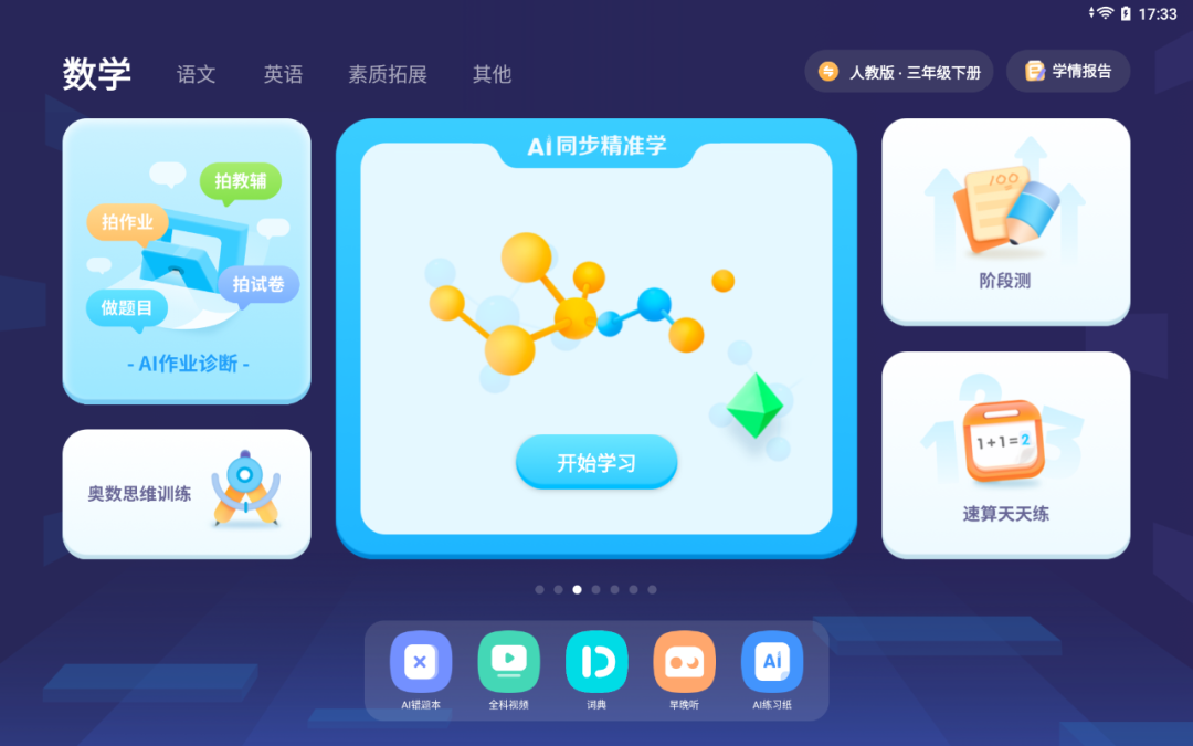 网易有道的AI学习机Y10支持小学阶段的数学学科的AI精准学功能。
