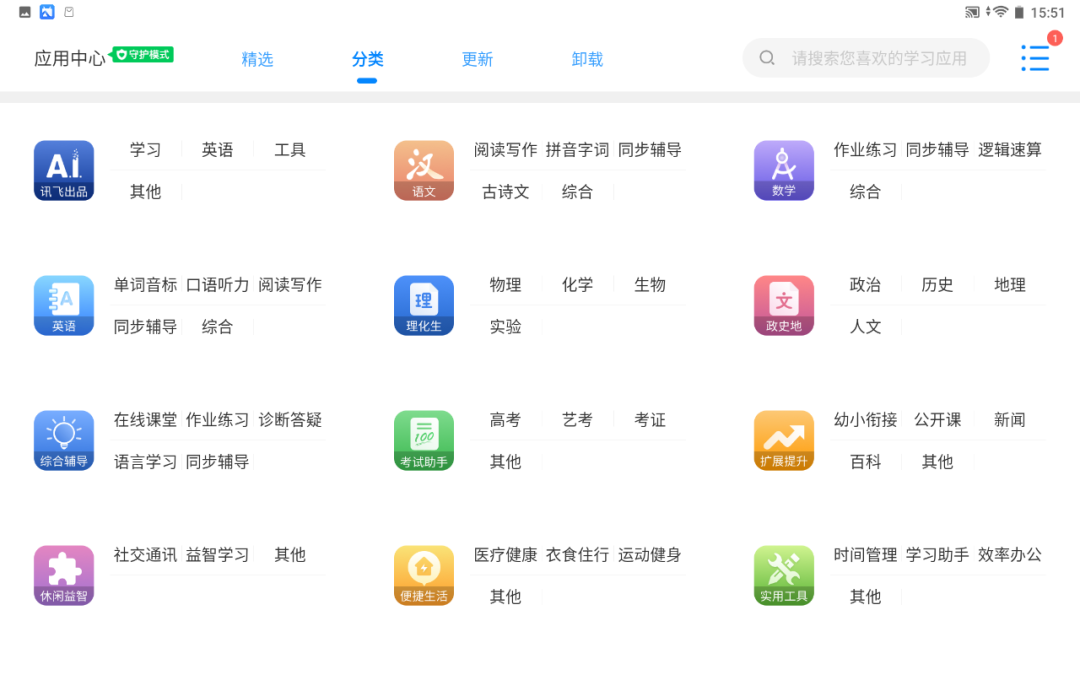 科大讯飞和网易有道提供了具有丰富学习资源的应用商店,基本上主要的学习类、网课类应用程序都可以进行下载。科大讯飞还专门为不同学科的应用程序进行了分类。