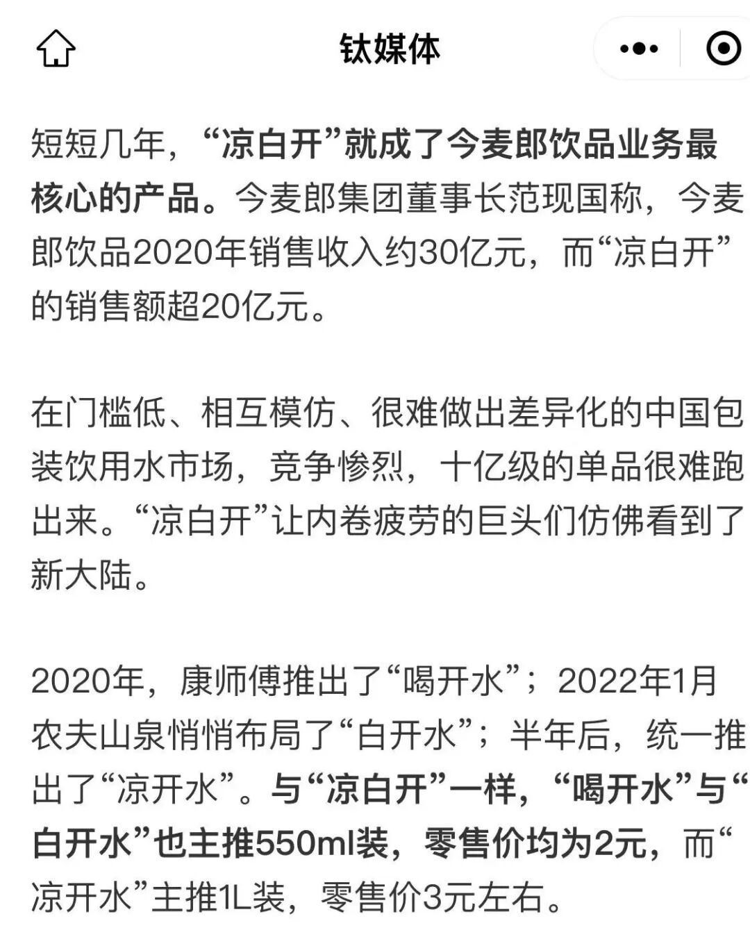 当然,这里说的不仅仅是今麦郎的“凉白开”,也包括所有那些很羡慕“聪明”的今麦郎挖掘到一个人*钱多的市场后,努力跟进的其他品牌,比如康师傅们。