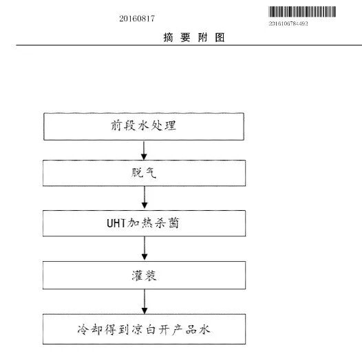 于是查了一下这个专利号2016106784492,名字叫做“一种凉白开生产工艺”。