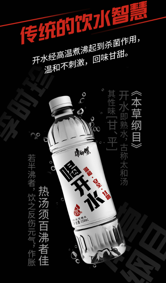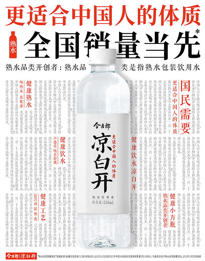 但饮料水里,甚至是说全饮料历史上最智商税的产品,非现在的“凉白开”莫属了 —— 一种靠羞辱中国人体质来忽悠钱的产品。