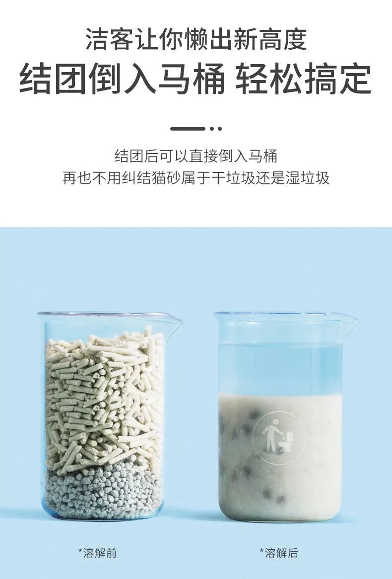 身为号称能冲厕所的猫砂,不堵马桶必须是必备优点了,如果冲厕所马桶堵了(一次倒太多的除外),那基本说明这款猫砂的融水性没救了。