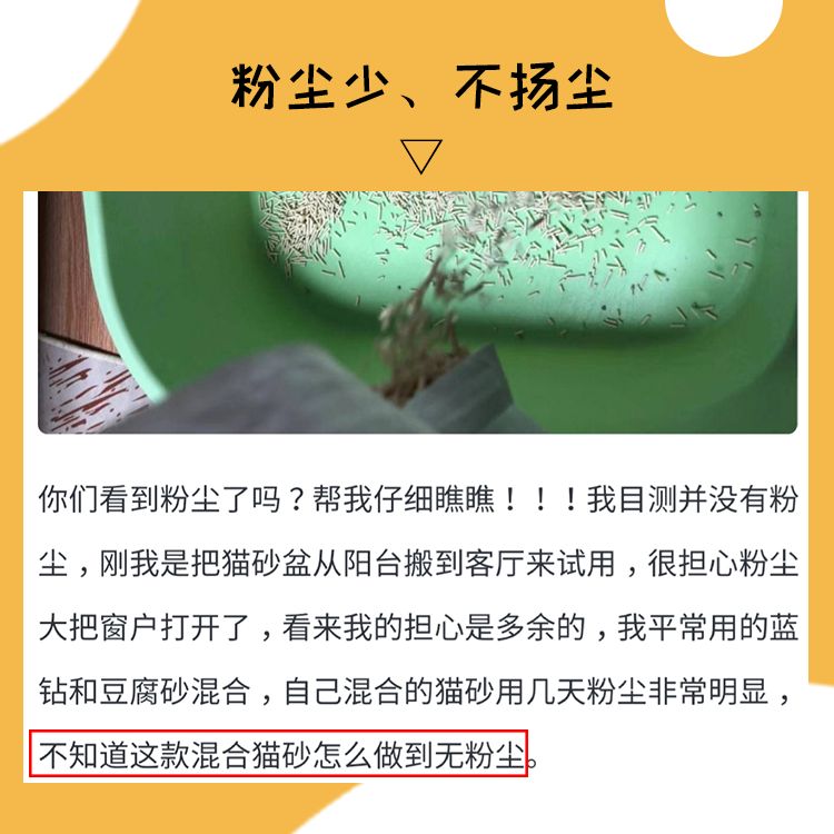 •猫砂的粉尘度——有部分粉丝反映有极轻微粉尘,但是同比其他品牌粉尘度低很多。