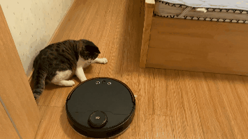 大部分扫地机器人的吸力普遍在1000-2000pa之间,而小狗R60为了做到真正“吸的干净,光脚没有颗粒感”,马达功率比上一代产品提升了62.5%,吸力高达5000pa~堪称扫地机器人界的专业吸尘器啊!很轻松的就能吸光大块的碎屑、猫砂、猫毛还有灰尘等。在我家卧室扫了一圈之后,尘盒里竟然装满了灰尘和毛发。为了测试吸猫毛的能力,我特意在比较湿的地板上粘了一大块猫毛,小狗R60依旧轻松解决。更难能可贵的是,在提升了马达功率和吸力之后还做到了静音清扫,一般扫地机器人吸力越大,噪音越大,这对养猫的人来说是大忌,主子根本接受不了很大的噪音。而小狗R60工作时声音沉闷不尖锐,完全不会影响我们刷手机追剧,何况它还有三种吸力模式可选,打开静音模式的时候,就算猫在睡觉都不会吵醒。▲达康不仅感觉不到声音还一直欺负它