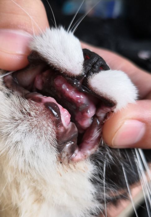 猫咪的牙龈大面积红肿,牙齿表面有严重的牙结石,口腔内还有增生的息肉,最后不得不把牙全部拔掉了……
