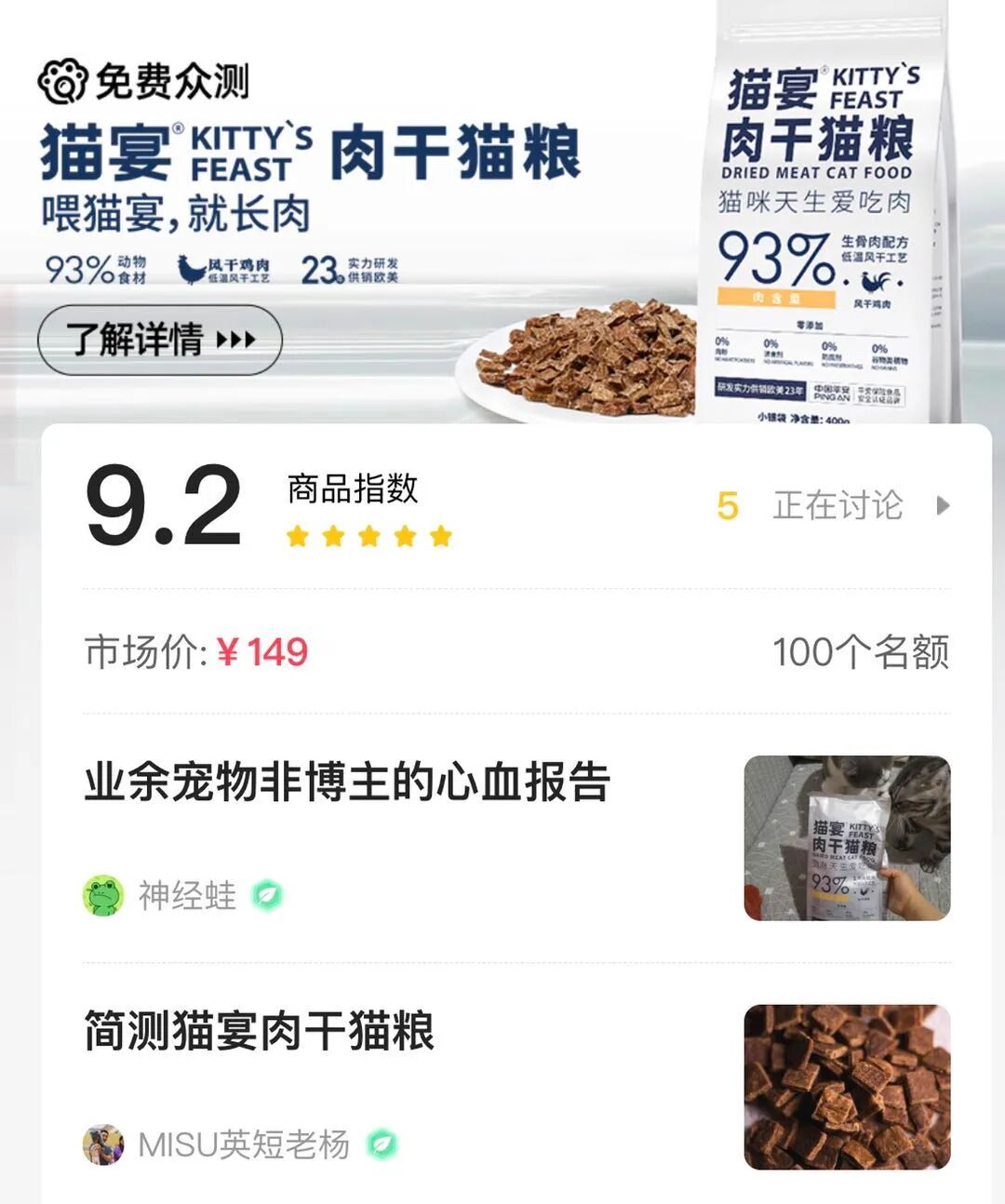 前几周,我们在爪测小程序上发起了一次“猫宴肉干猫粮”的众测,一呼百应,这次活动超过1200名铲屎官参与 ,我们选取了其中的100名,作为猫宴肉干猫粮的测评官。
