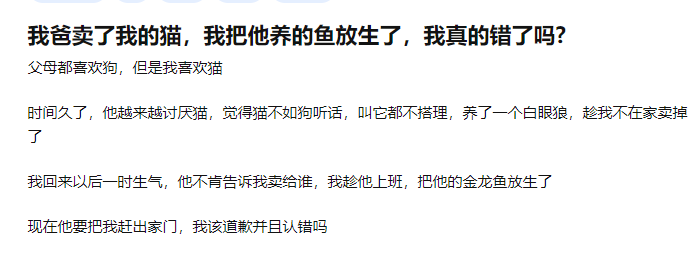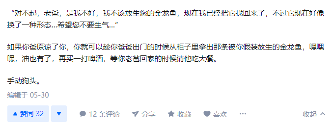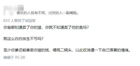 网友回家后找不到猫,父亲说猫被他卖了!随之很生气,就在知乎上发了一条这样的动态!称“父亲卖了自己的猫,然后他放生了父亲养的金龙鱼”。