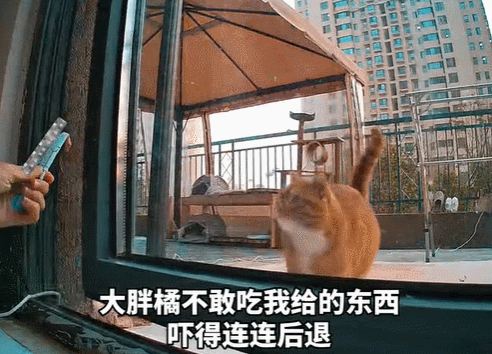 女孩儿也想让小胖橘进屋玩,但怎奈小胖橘警惕性强,胆子又小,连女孩儿给它的零食都不敢碰。