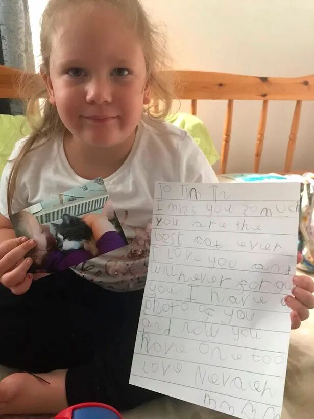 Nevaeh一天天长大的同时,Tintin也在一天天地变老,直至走向喵生的尽头。那天夜里,Nevaeh早早地睡着了,而年老的Tintin,在家人的陪伴下咽下了最后一口气。在走之前,它曾用力地看向Nevaeh房间的方向,大家都知道,那是它在人间唯一放不下的牵挂。第二天一早,睡醒的Nevaeh往常一样,跑进Tintin最爱的房间叫它起床。许久见不到Tintin的Nevaeh,每天都会在睡前哭泣,五岁的她并不懂得什么是死亡,她只是想知道,自己最好的朋友到底去了哪里。“每只猫咪都有个使命,找到心爱的小孩并给他们带去快乐,如果想它,可以抬头看星星,最亮的那颗就是Tintin。”Nevaeh听进了妈妈的话,她提出要给远在喵星的Tintin写一封信。虽然那里很远,虽然回信很慢,但她想让Tintin知道,远在地球的她,还在等它回家。为了确保信件可以准确地交到Tintin手上,Nevaeh还特意注明了收信地址——天空中最亮的那颗星,天堂。信里的字迹歪歪扭扭,但写满了一个五岁女孩,对去世猫咪的思念。