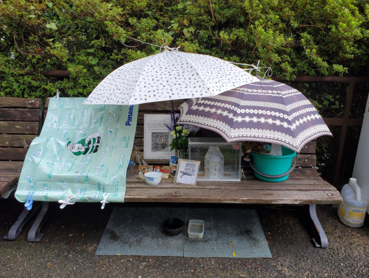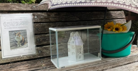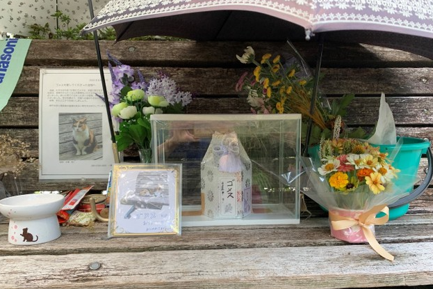 大家在生前最爱的长椅上为它布置了灵台,送上了许多花。