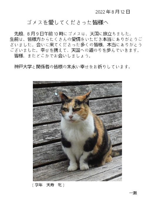 2022年8月12日,日本神户大学发布了一条小猫咪的讣告,陪伴了同学们24年的Gomez,离开了这个世界。