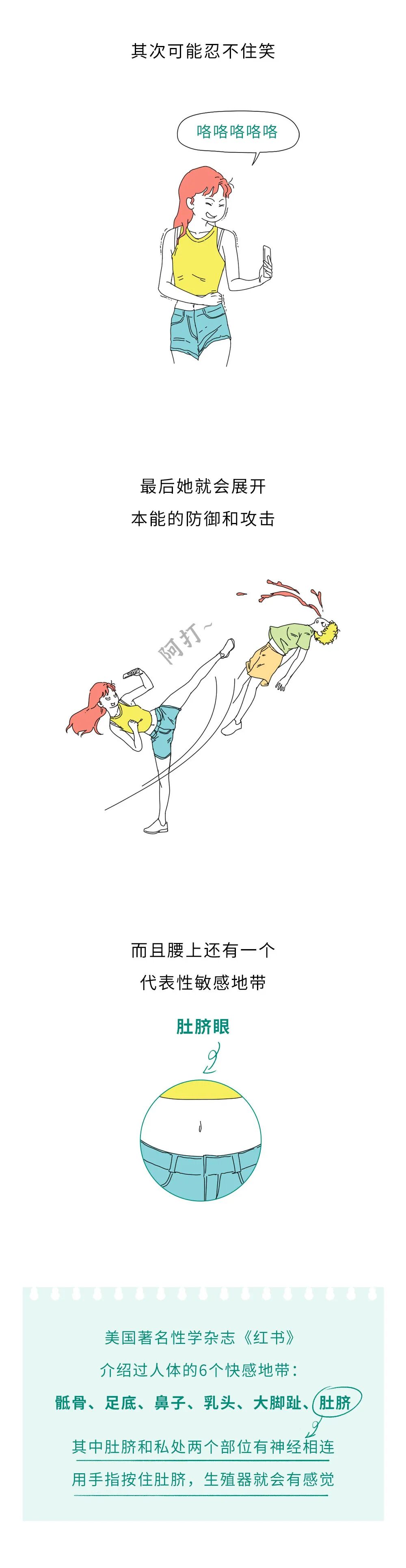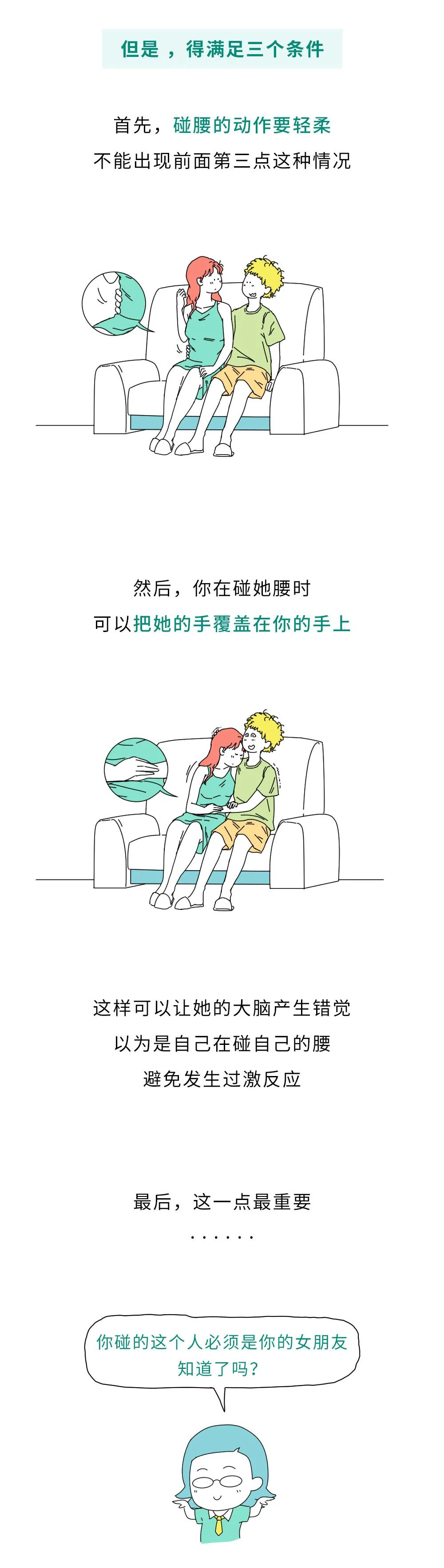 用手指按住肚脐,生殖器就会有感觉所以在碰女生腰的时候如果不小心抠到了肚脐眼,可能就会...最后,女生的腰部还很脆弱如果你碰女生腰时没轻没重,可能会要伤害到她们。腰部分布着很多人体重要的器官它被称作人体最易受损的内脏,在各种腹部外伤中脾脏损伤率高达40%~50%受损严重时,脾脏甚至会像破碎的豆腐,连缝合都不可能,只能摘除,如果用力碰腰部,很可能就会伤到它。另外,女生来大姨妈时前列腺素分泌,会促进盆腔血管扩张造成肌肉收缩就算不碰,女生也会经常出现腰疼。然后,你在碰她腰时可以把她的手覆盖在你的手上这样可以让她的大脑产生错觉以为是自己在碰自己的腰避免发生过激反应最后,这一点最重要,你碰的这个人必须是你的女朋友,知道了吗?
