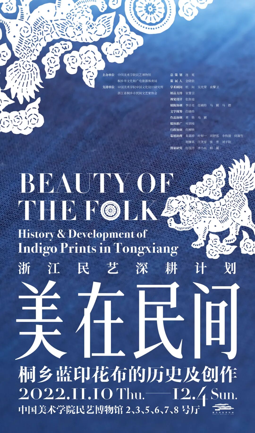 “美在民间——桐乡蓝印花布的历史及创作”展于2022年11月10日——12月4日在中国美术学院民艺博物馆展出。本展览由中国美术学院民艺博物馆、桐乡市文化和广电旅游体育局联合主办,中国美术学院中国文化设计研究所、浙江省桐乡市民间文艺家协会为支持单位。本展览由连冕担任总策划,杭间、吴光荣、哀警卫为学术顾问,金晓依为策展人。展览以桐乡蓝印花布的历史发展演进为脉络,分成“民族图案:林汉杰的‘蓝印田野’”、“走向非遗:蓝印花布的近现代发展”、“新‘丰同裕’:哀警卫的继承与探索”三大模块,比较全面地展现了桐乡蓝印花布在历史浪潮中自我发展,自我更新的过程与风貌。