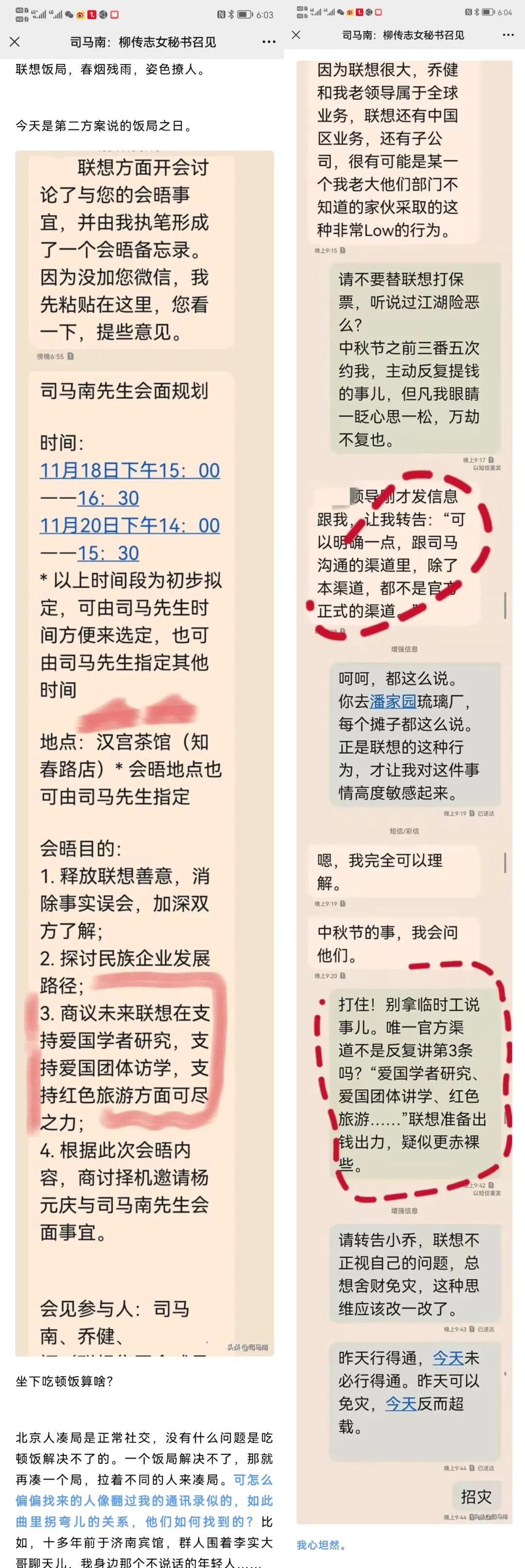 最后,等到联想受不了之后,大概率就会来沟通,那么中间找到漏洞,继续出牌,于是就有了后面曝光沟通细节,以及直接展示了一系列人的名字,这一波之后,司马南清廉正直的形象再一次提升,联想资本家喜欢私下解决的嘴脸再次加重。