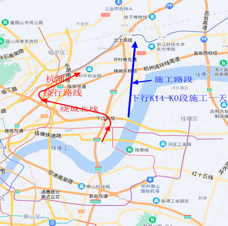 一旦施工点后方发生拥堵,相关部门将在下沙枢纽K14和绕城东枢纽K6启动应急分流预案,分流路线为: