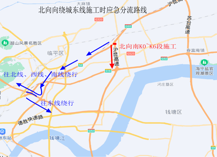 2022年9月28日6:00至17:30,杭州绕城高速东线上行方向K0~K6段(沈士互通至绕城东枢纽)占道施工,请广大驾驶员提前通过沪杭高速骑塘枢纽或2号枢纽绕行S9苏台高速或G1522常台高速。