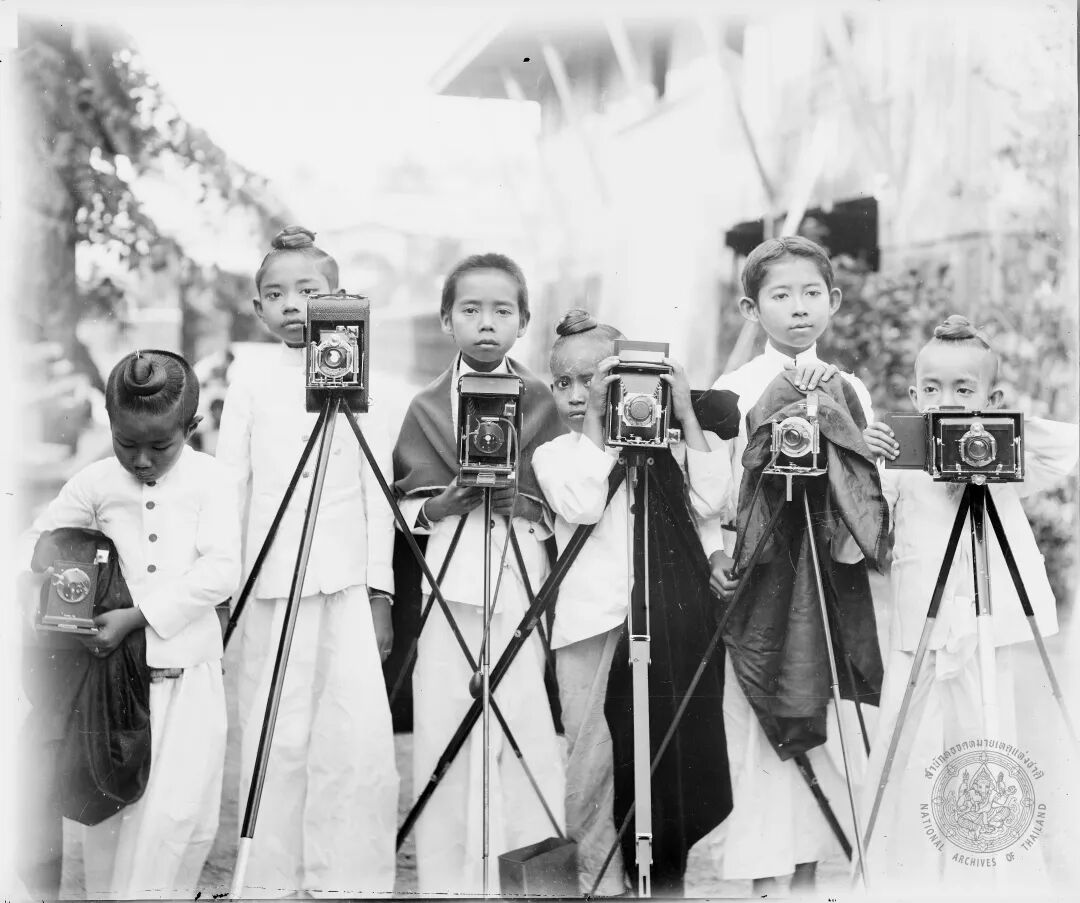 朱拉隆功国王的儿子和侄子们,以及他们的相机。曼谷杜西特宫,约1904年。由泰国国家档案馆提供。