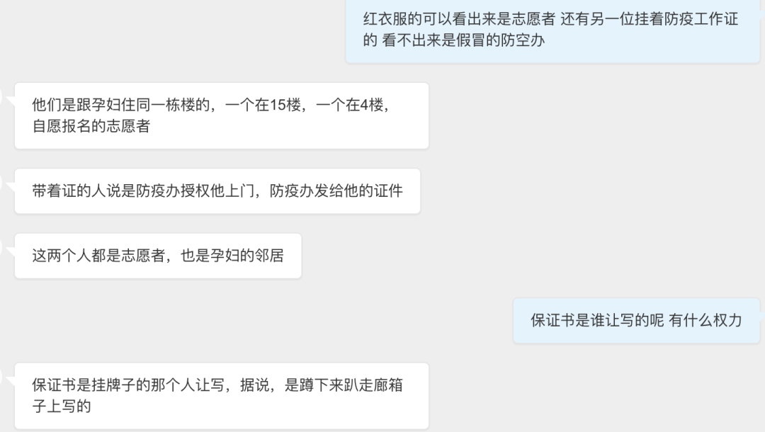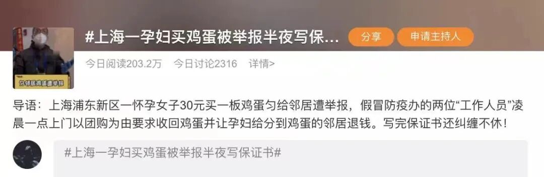 然后,孕妇就被做志愿者的邻居(非上文拿了鸡蛋的邻居)举报了违反防疫政策。故事到此我也能接受,不能接受的是,防疫的工作人员和志愿者在凌晨一点叫醒孕妇接受调查,前提是在孕妇已经把鸡蛋钱退给了邻居,鸡蛋也已经回收。不管不顾的就是要求孕妇当晚必须写完保证书。