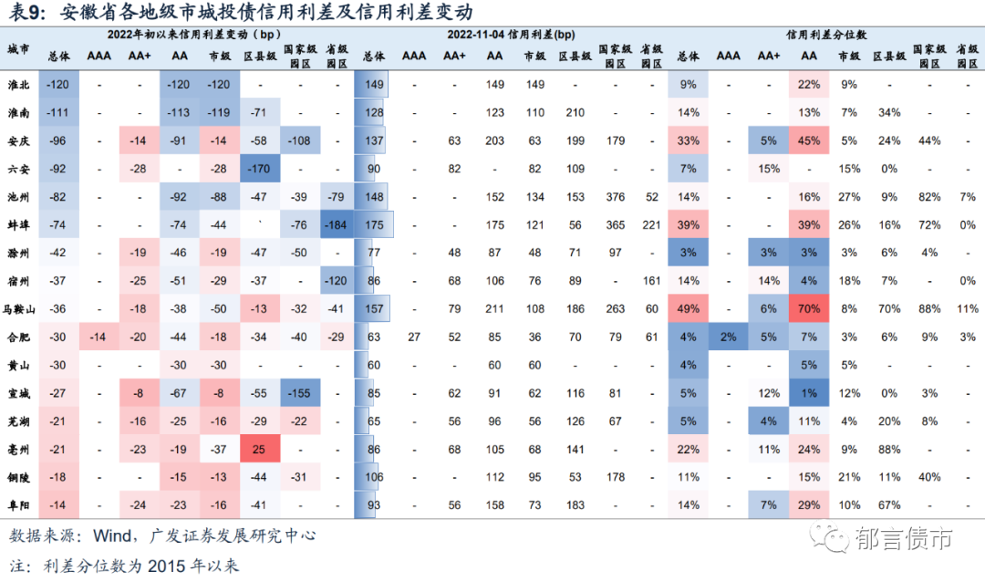 分地级市来看,2022年以来各地级市信用利差均有所收窄,大部分地级市处于历史20%分位数以下。淮北和淮南城投债整体信用利差收窄幅度较大,较年初收窄100bp以上,分别为120bp和111bp,主要由市级平台带动。铜陵和阜阳信用利差收窄幅度相对较小,在20bp以内,其余地级市信用利差收窄幅度以20-50bp为主。