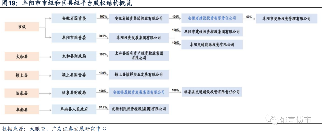 平台概况方面,阜阳市共有9家存量债平台,其中市级平台4家,区县级平台4家,其他园区平台1家。4家市级平台分别为阜阳投资发展集团有限公司(“阜阳投发”)、 阜阳市建设投资控股集团有限公司(“阜阳建投”)、阜阳市安居投资管理有限公司(“阜阳安居”)、阜阳交通能源投资有限公司(“阜阳交投”),其中阜阳建投和阜阳交投为阜阳投发全资子公司。