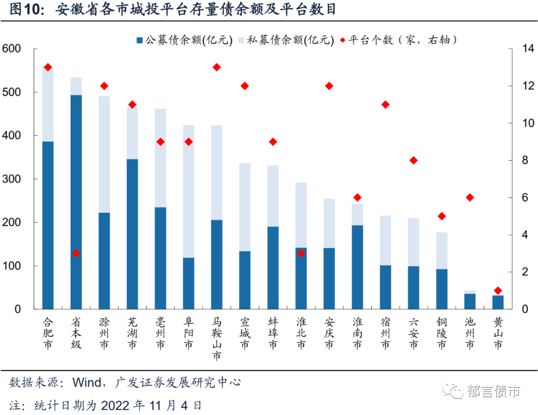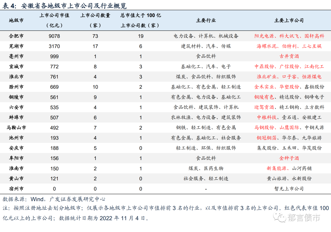 我们重点选取了城投存量债规模较大的省本级、合肥、滁州、芜湖、阜阳和马鞍山,分别从产业结构和平台概况等方面进行详细分析。