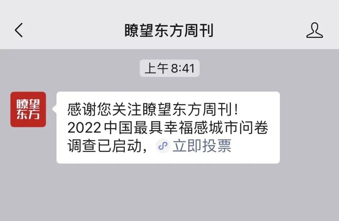 1.关注“瞭望东方周刊”微信公众号,在弹出的消息对话框中,点击“立即投票”进入小程序参与问卷调查;
