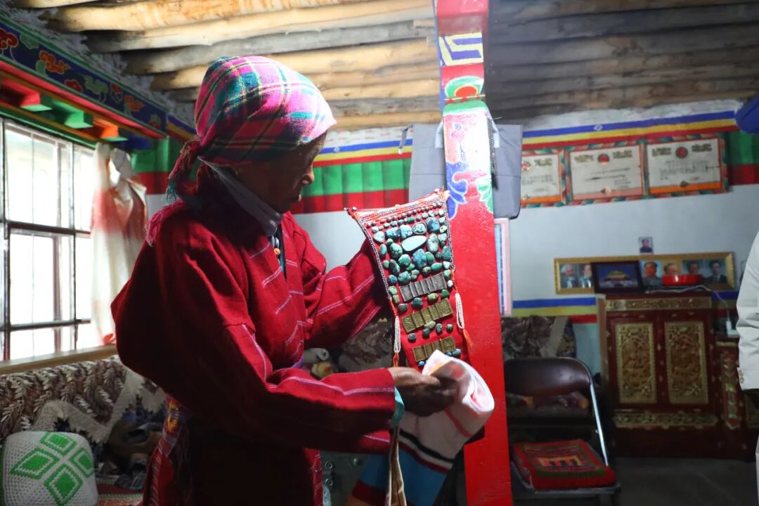 仁增旺姆正在擦拭“宣”舞饰品。记者 达珍 摄