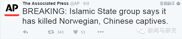 美联社消息:伊斯兰国(IS)11月18日(周三)宣布,他们已经杀害了一名中国人质和一名挪威人质,原因是两个月过去了,他们没有获得赎金。美联社还称,该组织在最新一期宣传册上公布了被认为是两人遗体的照片。